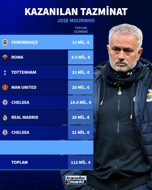 08月30日讯 费内巴切昨日官宣穆里尼奥下课,这是他执教生涯第7次被解雇。有报道称穆里尼奥此次将获得1200万欧的解约赔偿,德转为此统计了穆里尼奥执教生涯的累计解雇赔偿金。